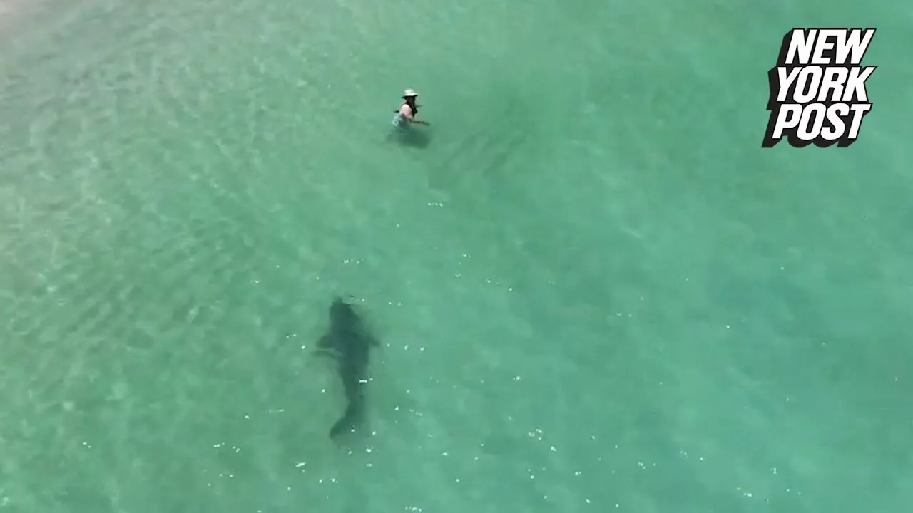 Heart-stopping drone footage captured by beachgoer Sam Wood shows the giant predator in the clear and iridescent Aussie waters — just meters from unsuspecting bathers.