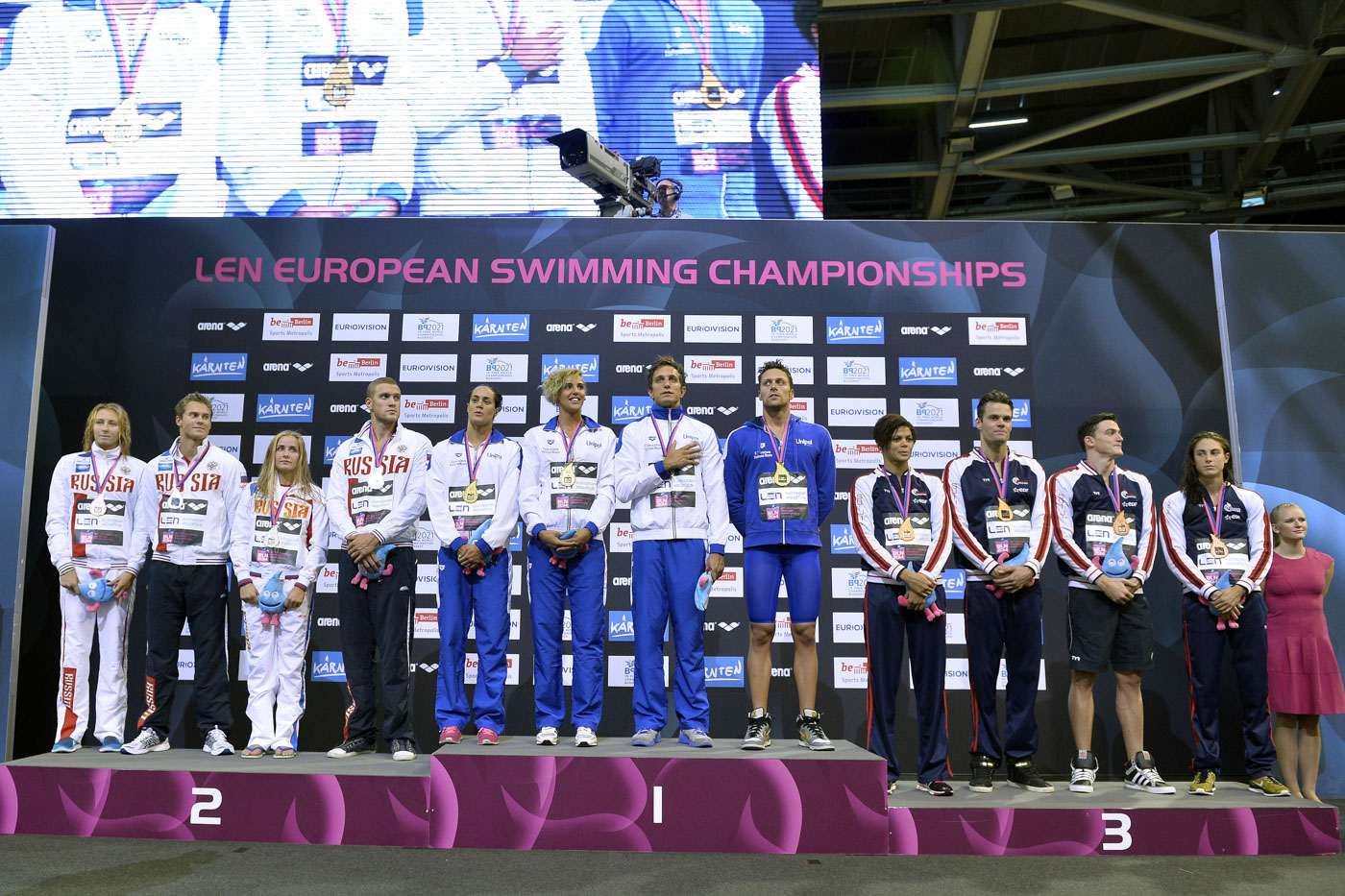 Russia Silver Medal, Italia Gold Medal, France Bronze 4x100m Freestyle Mixed